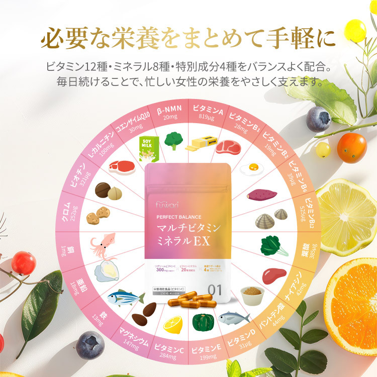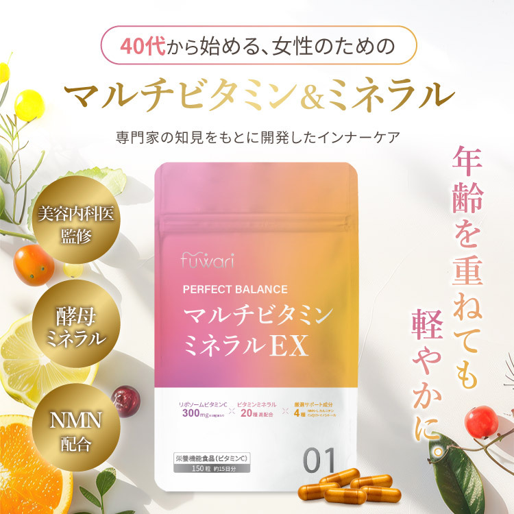 40代からの女性のためのマルチビタミン&ミネラル。 専門家の知見をもとに開発された、fuwariのインナーケア。