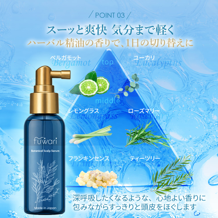 【お得な定期便】配送周期も選べるお得な定期便です。 年齢とともにゆらぎやすい頭皮に、 スキンケア発想のうるおいを。 二層オイルインのボタニカルエッセンスが、 乾燥・かゆみが気になる地肌を整え、 翌朝の髪印象をサポートします。 タオルドライ後も乾いた頭皮にも使える、 毎日続けやすい頭皮美容液です。